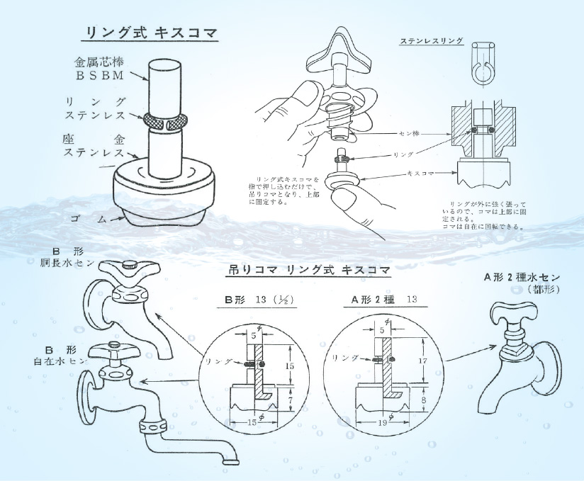蛇口から水がポタポタ垂れてくる…そんな苦情が、昭和40年頃、水道局に殺到しました。昭和41年に創業したばかりの三和商工は「私たちの技術でこの問題を解決したい」その思いから「キスコマ」を開発しました。そのキスコマは全国をあっという間に席巻し、人気商品となりました。三和商工の「お客様のお困りごとを解決する」という理念は、以来、脈々と受け継がれています。