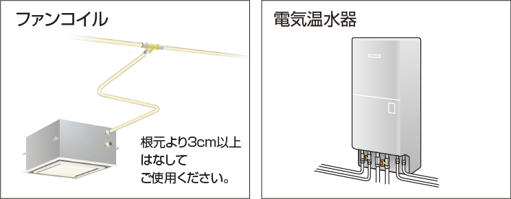 電気温水器・ボイラー・ソーラー・ガス給湯器・浄水器・仮設配管・ファンコイルなど、フレキをカットしてセッティングするだけで使用できます。